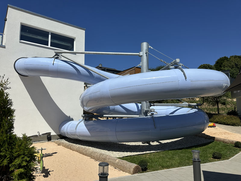 For the colorful indoor and outdoor adventure world, we supplied an 80 m insulated tube slide with stairs, spray cannons, toddler slide and the Aunt Frida parrot as a splash figure in the toddler pool.