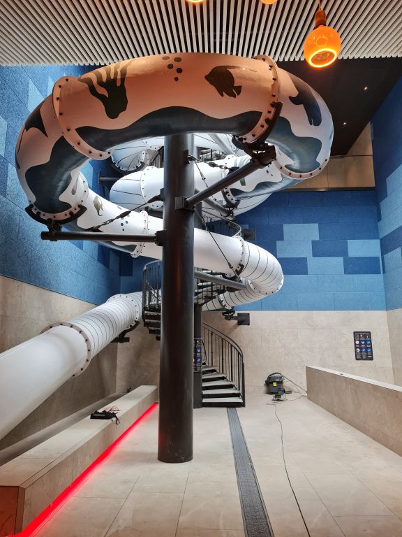 Die Breitrutsche und eine Röhrenrutsche mit zahlreichen LED-Effekten unterstreichen die moderne Architektur. Ein perfektes Beispiel, dass sich moderne Architektur und ansprechende Attraktionen nicht ausschließen, sondern perfekt harmonieren können.