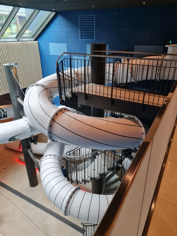 Für das Rutschabenteuer durfte AQUARENA im Spa Bereich eine 63 m lange Röhrenrutsche RR0825 bauen, die mit vielen abwechselnden Lichteffekten ausgestattet ist. Für die gemeinsame Rutschfahrt eine Breitrutsche AquaWide mit knapp 20 m Länge – und auch für die kleinen Gäste gibt es pure Freude mit einer Kleinkinderrutsche.