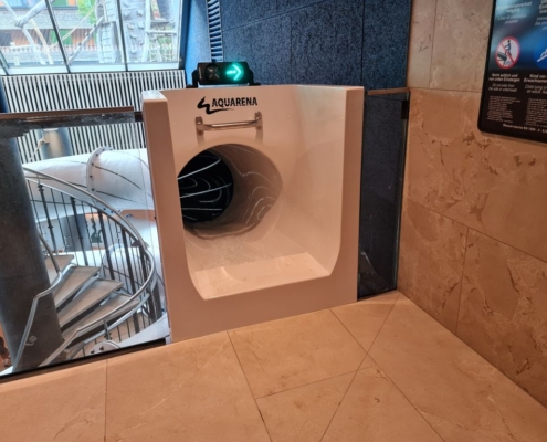 Eine besondere Herausforderung war es, die Rutschenanlage trotz Platzmangel in das bestehende Bad einzuplanen. Wie man sehen kann, ist dies sehr gut gelungen.