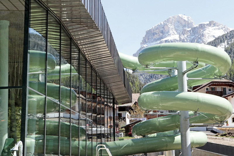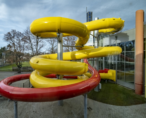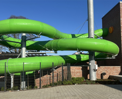 Durch unserer Wärme- und Schalldämmung der Wasserrutsche wird der sonst permanent anhaltende kalte Luftzug in der Landehalle unterbunden und es entsteht ein angenehmes Raumklima für den Badegast.