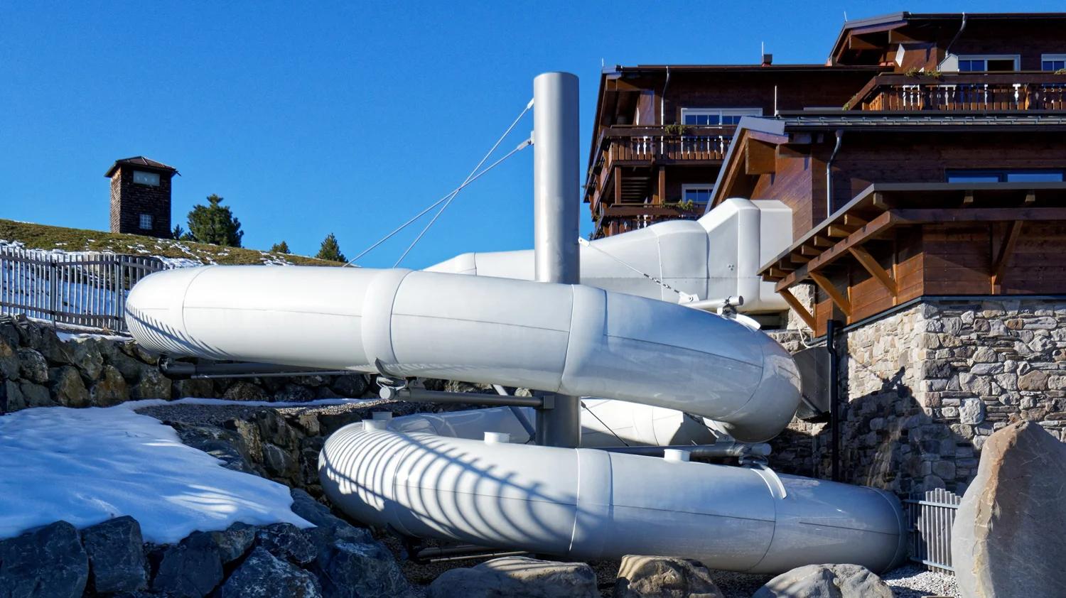 • Durch die zusätzliche Dämmschicht an den Röhren und den Flanschen wird die gesamte Rutsche gegenüber Witterung, UV-Einstrahlung und großen Temperaturunterschieden besonders geschützt.