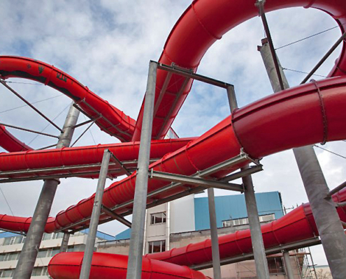 Der AquaRacer ist eine abwechslungsreiche Reifenrutsche mit wechselnden Querschnitten, die offen oder geschlossen sein können, mit langen, breiten Geraden und engen Kurven. Unterschiedliche Gefälle sorgen in der Bahn für aufregendes Tempo – Racefeeling pur!
